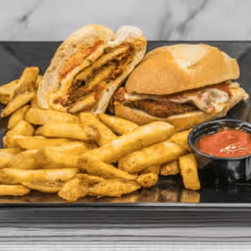 Lightly breaded chicken cutlet, our battered eggplant with fresh mozzarella, roasted peppers & balsamic glaze served on ciabatta (one size)