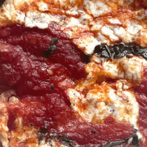 A blend of two tomato sauces with fresh mozzarella, seasonings, and topped with basil pesto