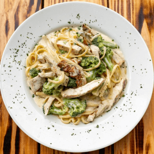 Homemade Alfredo sauce with homemade grilled chicken and broccoli