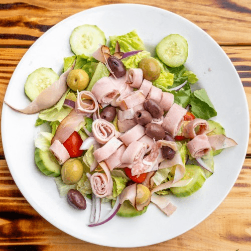 Ham, salami, provolone, tomato, onion, and olives. All salads come with fresh homemade bread