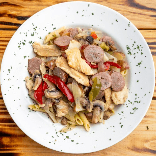 Garlic white wine sauce with sausage, peppers, onions, mushrooms, and potatoes