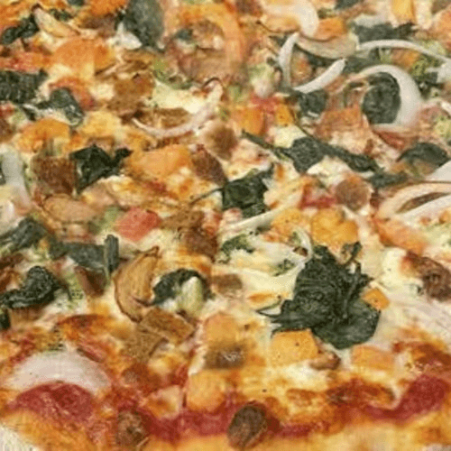 Sausage, pepperoni, meatballs, green peppers, onions, & mushrooms
